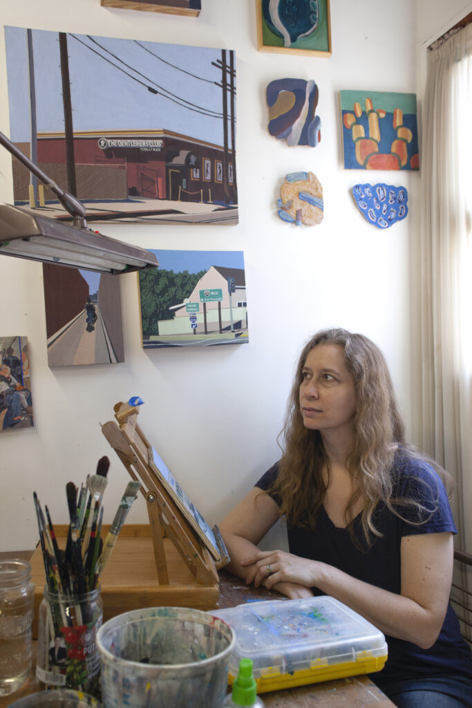 When I was 13 I started writing to help make sense of the world around me. I would rewrite my entire day as a way to process it. I also wrote random weird kid stuff in there, too, of course. Later, I wrote for the school paper, and as a teen journalist for the Fort Worth Star Telegram. I ended up studying art in college, and for 20 years I have been a painter of Los Angeles scenes and infrastructure. After college, I came up with a design for a handheld printmaking press kit, and started printmakingpress.com. True to my ‘spicy ways, I also do graphic design and web design. My other hustles include designing fabric that I sew into kitchen towels, creating sewing and paper patterns, and drawing child and pet portraits. I also do some cleaning and pet sitting because times right now are tough. I live in a very small house in an LA County suburb with my husband, child and dog. It is not a wild farmhouse, but I pretend it is.