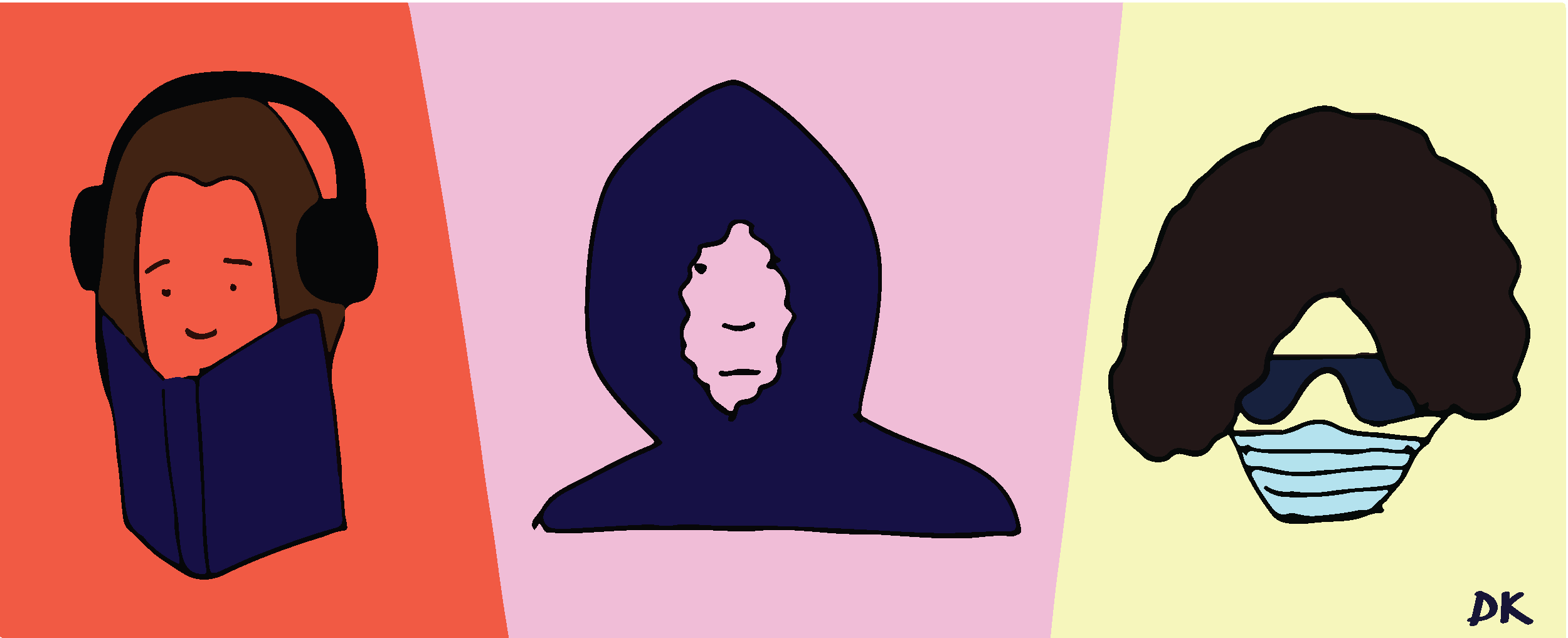 drawing of "neurospice girls" shows girl with noise protections ear muffs reading a book, a girl with a tightly closed hoodie, and a girl with sunglasses and a mask